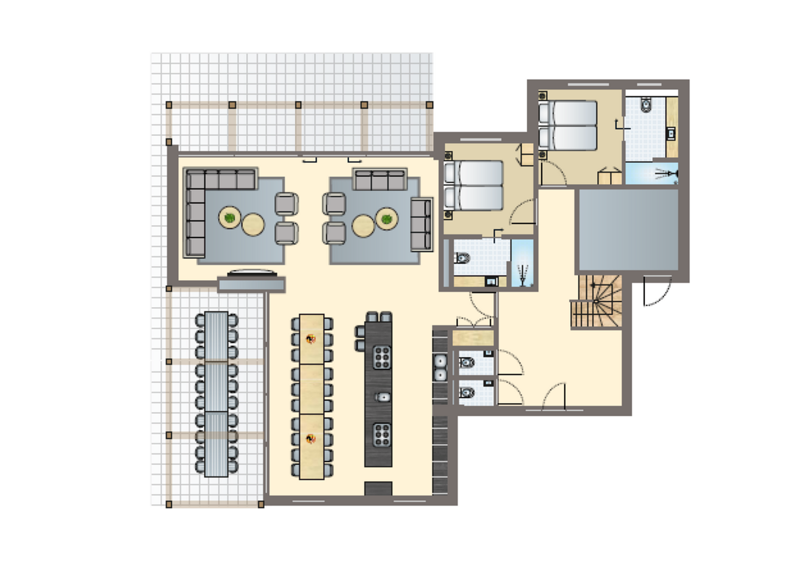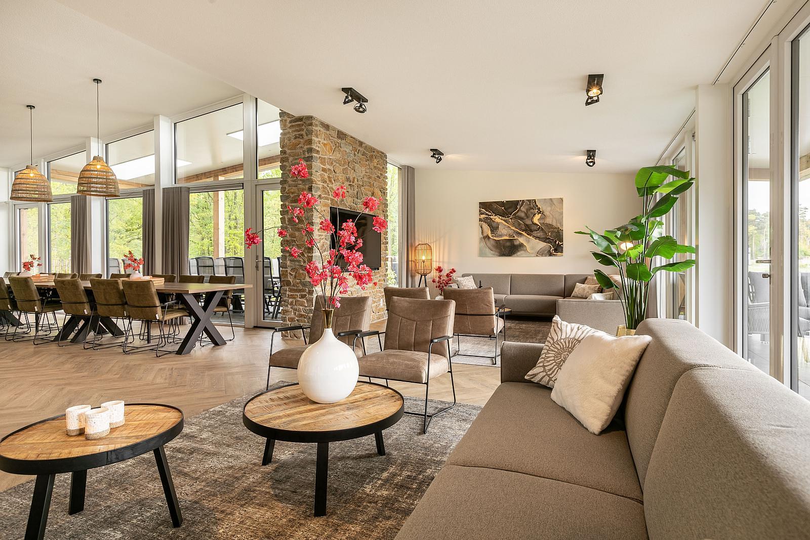 Zeer ruime en comfortabele vakantievilla voor maar liefst 20 personen. De villa heeft een royale woonkamer met twee grote hoekbanken. De open keuken is voorzien van een kookeiland om met het hele gezelschap heerlijke gerechten te maken. Op de begane grond zijn drie slaapkamers met elk een aangrenzende badkamer. Op de eerste verdieping zijn twee slaapkamers met eigen badkamer. De overige 3 slaapkamers hebben prachtig uitzicht en kunnen gebruik maken van een ruime badkamer met ligbad. Op de eerste en de tweede verdieping is een aparte toilet. De woning heeft op de tweede verdieping twee slaapkamers en een wellnessruimte. Een slaapkamer met een badkamer ensuite en de andere slaapkamer maakt gebuik van de inloopdouche in de wellness ruimte. Buiten is een groot overdekt terras voorzien met plaats voor minimaal 20 personen. De woning heeft de beschikking over eigen parkeergelegenheid op eigen perceel voorzien van een zeer grote berging.