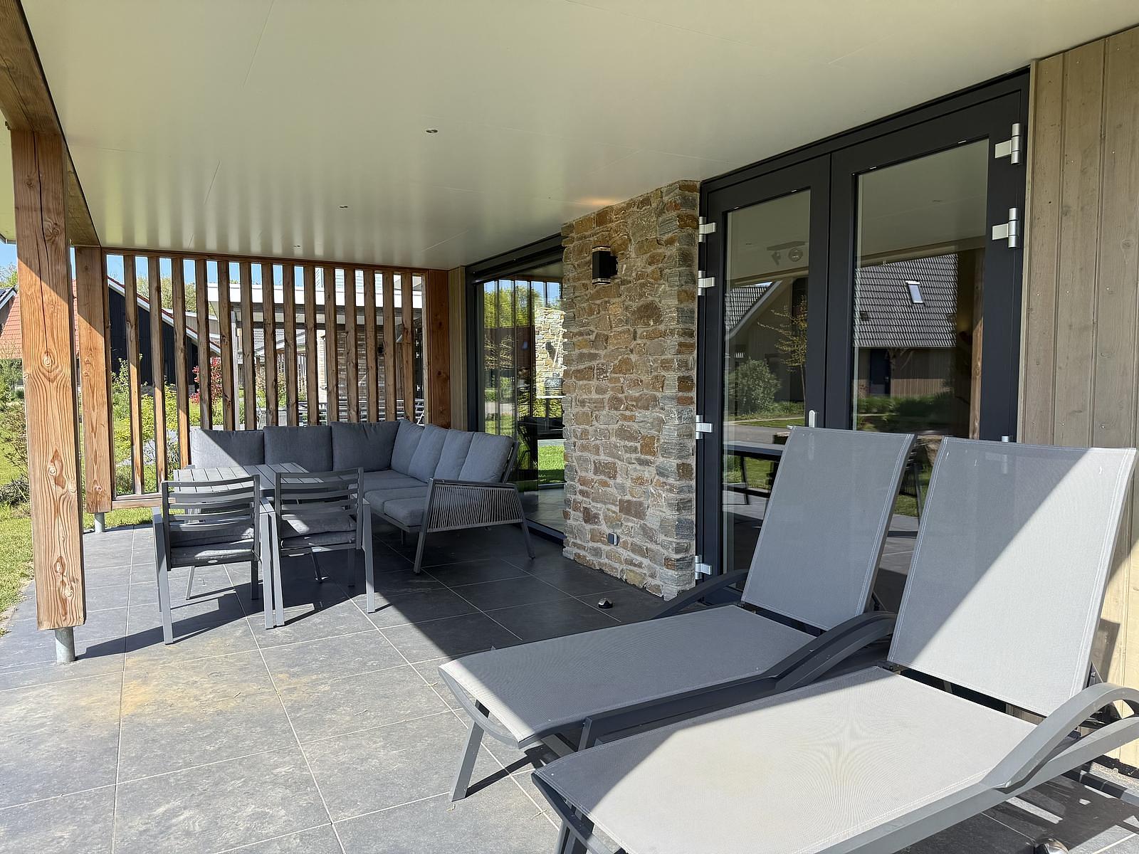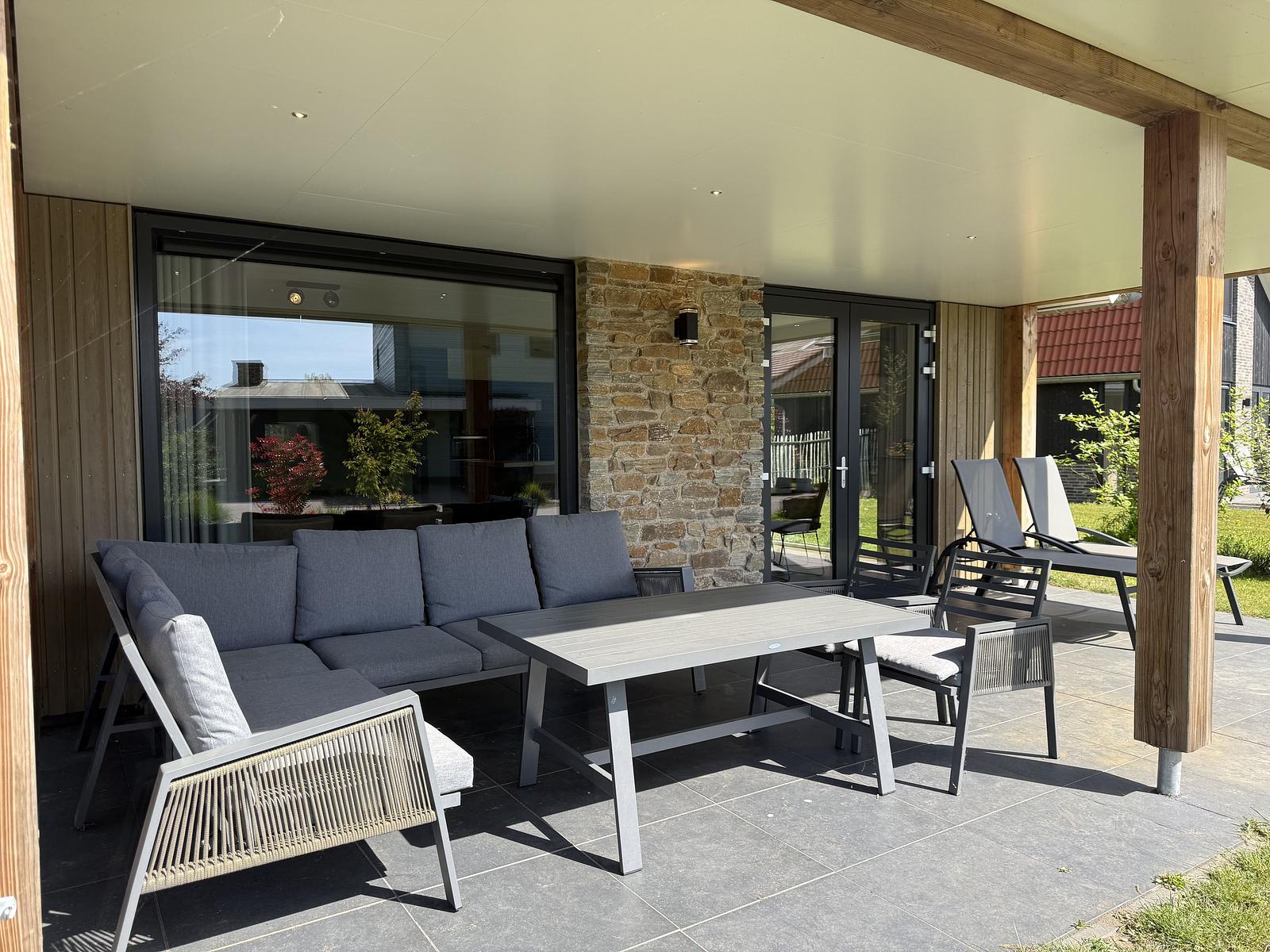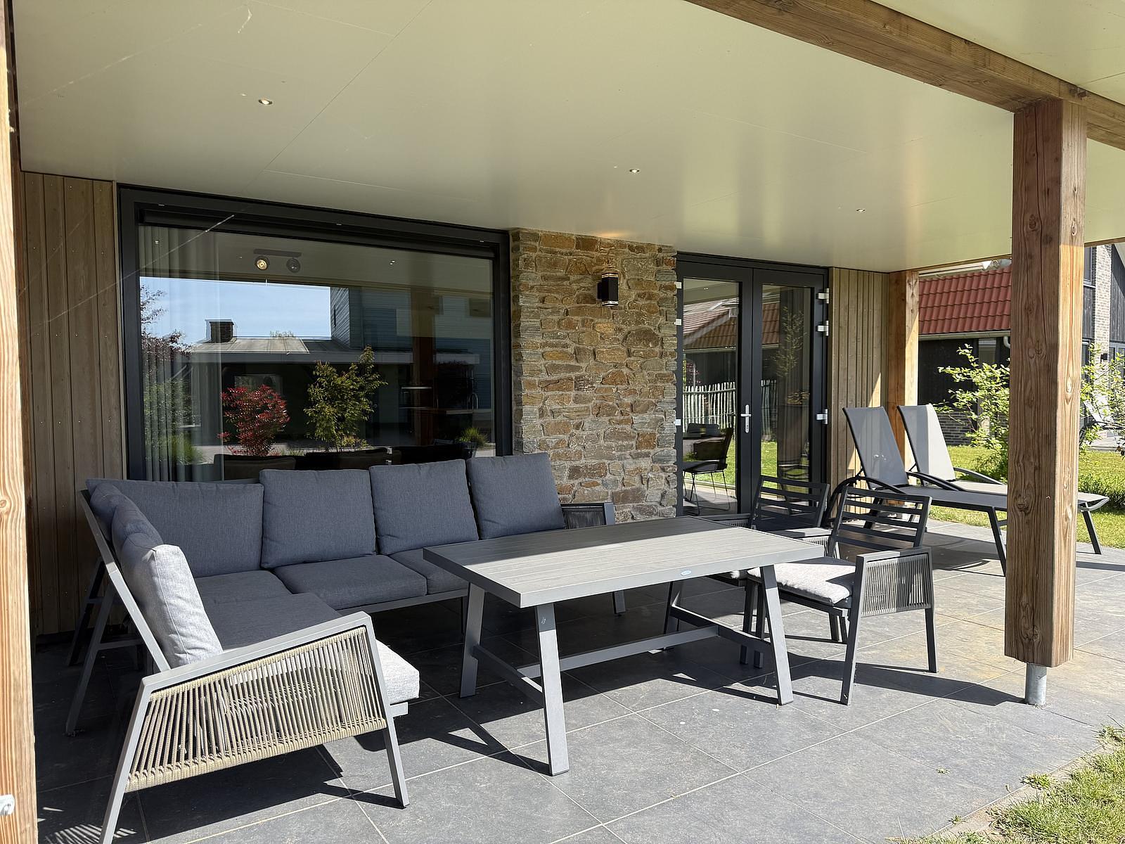 Buiten geniet u het hele jaar door onder de imposante veranda (725 x 300 cm) die over de hele breedte van het huis loopt. Met de aanwezige luxe ligbedden is dit dé plek voor een goed boek met uitzicht op de natuur.